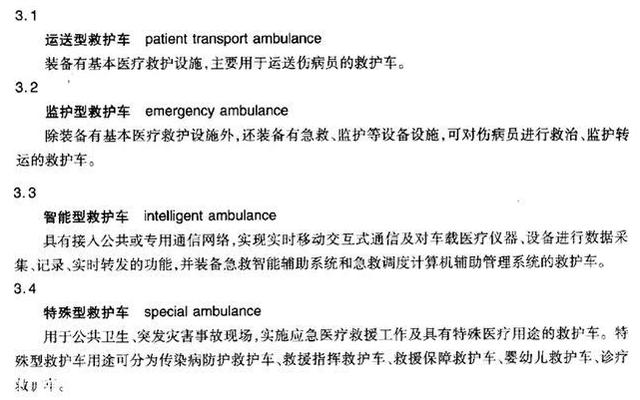 國家質(zhì)量監(jiān)督檢驗檢疫總局發(fā)布的GB/T 17350-2009《專用汽車和專用掛車術(shù)語、代號和編制方法》、工信部2014年3月1日實施的QC/T 457-2013《救護(hù)車》、衛(wèi)生部2008年4月1日實施的WS/T 292-2008《救護(hù)車》,都對救護(hù)車有著各自的定義。