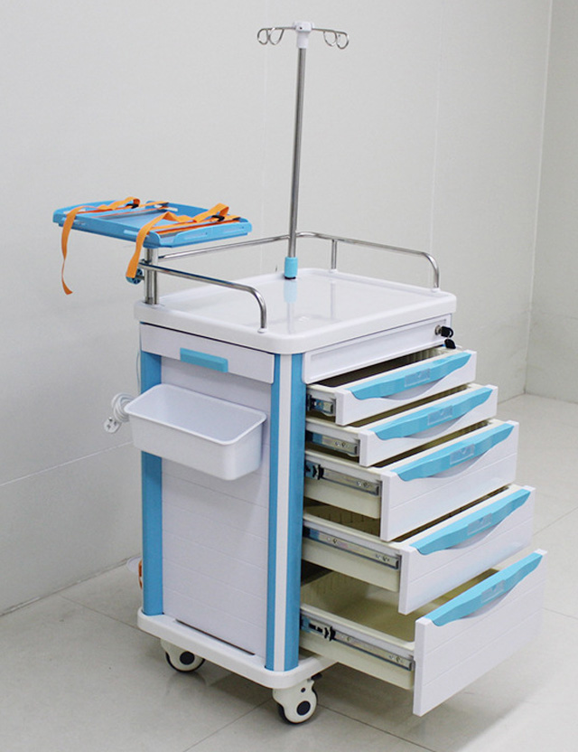搶救車的基本構(gòu)造是車體、輪子、還有醫(yī)用櫥柜。櫥柜的柜體是放藥品的空格。車體有固定氧氣瓶的套筒。還配有輸液架,還有多個放物品的抽屜。蓋板可以蓋住藥物。采用了塑鋼材料,包含工作臺面,雜物箱,輸液架,輪子,垃圾桶。一般分四個層次,急救藥品區(qū),放置一定數(shù)量的急救藥品,根據(jù)藥品使用頻率來依次排列。輸液區(qū),放了輸液器、注冊器、留置針、止血貼、消毒棉、砂輪、等。呼吸物品區(qū),開口器、壓舌板、吸氧管、各種型號插管喉鏡。其他物品,溫度計、血壓計、電筒、負(fù)壓吸引器等。