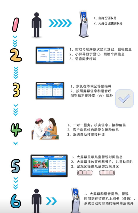 第一步,預(yù)防接種的叫號(hào)機(jī)刷身份證取號(hào)無身份證觸摸取號(hào)兩種方式。第六步,大屏幕名字顯示和語音呼叫,留觀時(shí)間到了后再機(jī)器上刷卡后系統(tǒng)自動(dòng)打印預(yù)約接種單就可以離開。